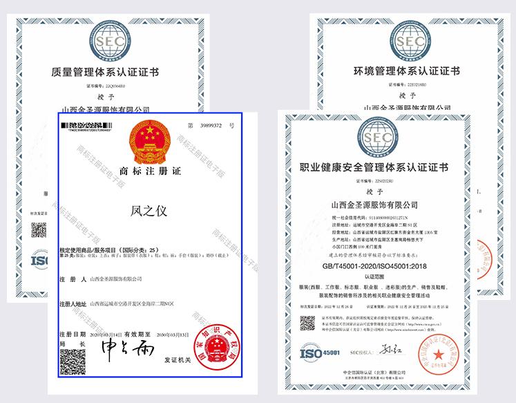 公司注冊了屬于自己的產品商標——鳳之儀,累計獲得了質量管理體系認證證書,環境管理體系認證證書,職業健康安全管理體系認證證書等國家專業認證文件。